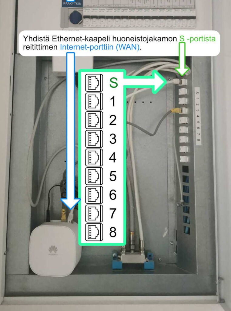 Yhteyden voi ottaa käyttöön kytkentäkaapin S -dataportista. Tietokoneen tai WiFi-reitittimen voi yhdistää tähän porttiin suoraan ja yhteys alkaa toimimaan. Kytkentäkaappi sijaitsee yleensä eteisessä ja se näyttää usein valkoiselta peltikaapilta.